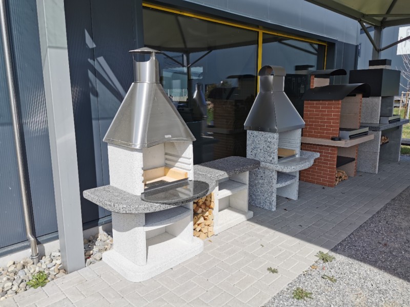 Granitweiss, gestrahlte Oberfläche, schwarze, geschliffene Arbeitsplatte mit eingelegter Granitplatte, mit Inox-Haube, Bodenplatte und Einschiebe-Rost (53x38 cm). Schamotteauskleidung und Edelstahlschutzblech im Feuerraum.