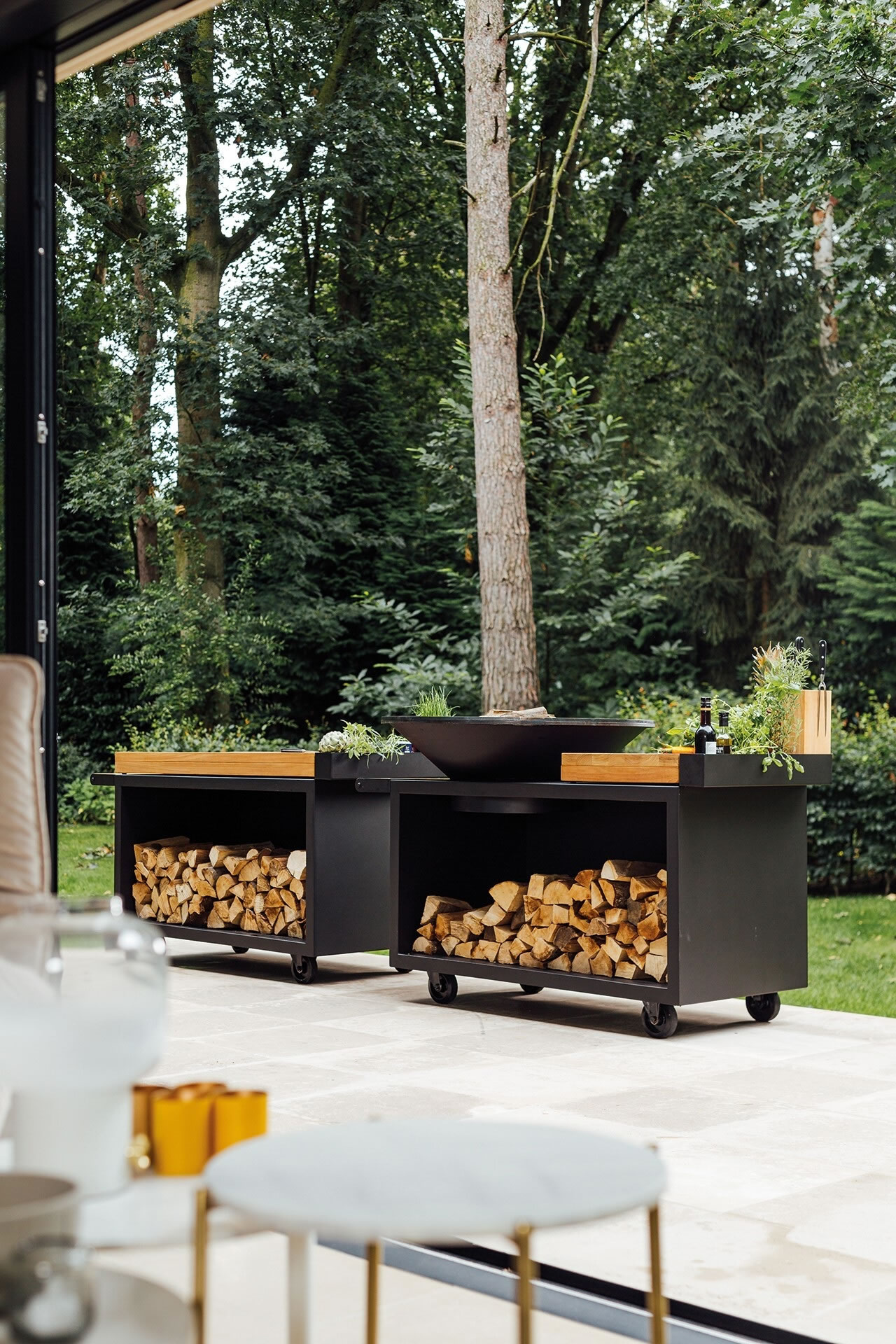Der OFYR Island Black 100 PRO Teakwood ist für den Einsatz im Catering, in der Gastronomie und Hotellerie entwickelt worden und ist die flexible Version des OFYR Island 100 auf Rädern mit einem tieferen Boden. Er verfügt über ein massives Schneidebrett, ein praktisches Zubehörfach und Platz für die Lagerung von Holz. Das Schneidebrett ist in Teakholz erhältlich.