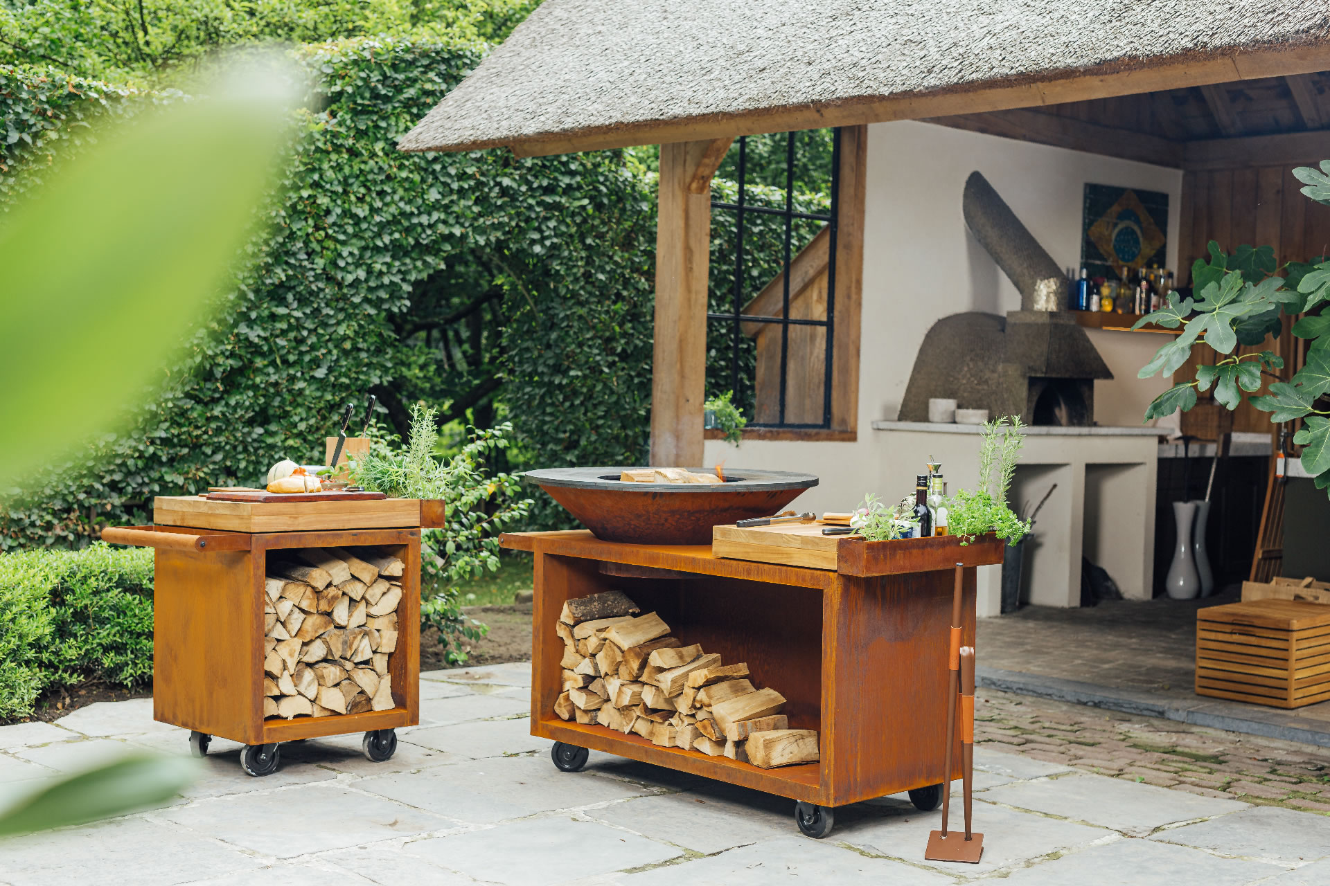 Der OFYR Island Corten 100 PRO Teakwood ist für den Einsatz im Catering, in der Gastronomie und Hotellerie entwickelt worden und ist die flexible Version des OFYR Island 100 auf Rädern mit einem tieferen Boden. Er verfügt über ein massives Schneidebrett, ein praktisches Zubehörfach und Platz für die Lagerung von Holz. Das Schneidebrett ist in Teakholz erhältlich.