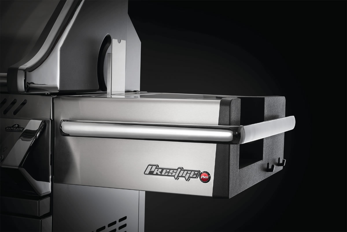 - Premium Seitenablagen aus Edelstahl mit integrierten Getränkehalter und Eis-/Marinadenfach mit Schneidebrett und Besteckhalter