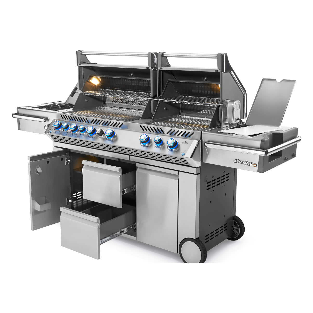 - Premium Seitenablagen aus Edelstahl mit integrierten Getränkehalter und Eis-/Marinadenfach mit Schneidebrett und Besteckhalter
