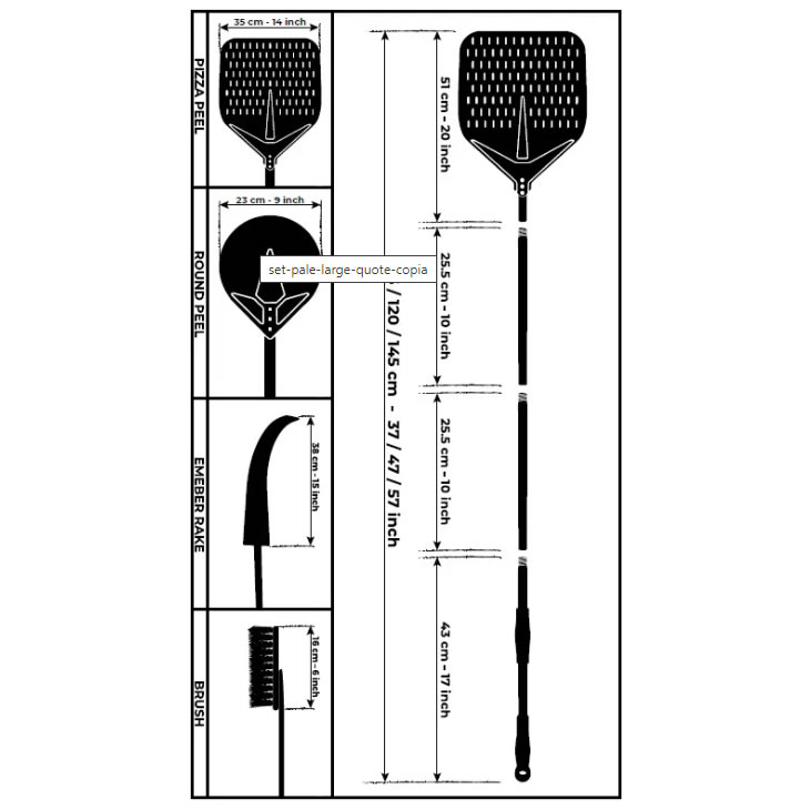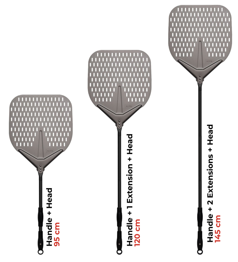 Alle Schaufeln lassen sich je nach Bedarf durch Zusammen- und Auseinanderschrauben von Universalzwischenstücken verlängern bzw. verkürzen (verstellbare Länge 95-120-145 cm).Das perfekte Schaufelset für alle, die auf der Suche nach Pizzawerkzeugen sind, die Technik, Leistung und Design verbindet.