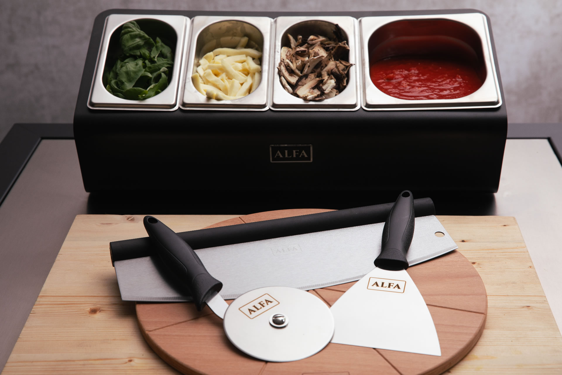 Der Zutatenhalter von Alfa ist ein vollständig in Italien hergestelltes Zubehörteil, mit dem Sie Ihren Platz besser verwalten und die Zubereitung Ihrer Pizza effizient organisieren können, indem Sie alles, was Sie brauchen, griffbereit haben.