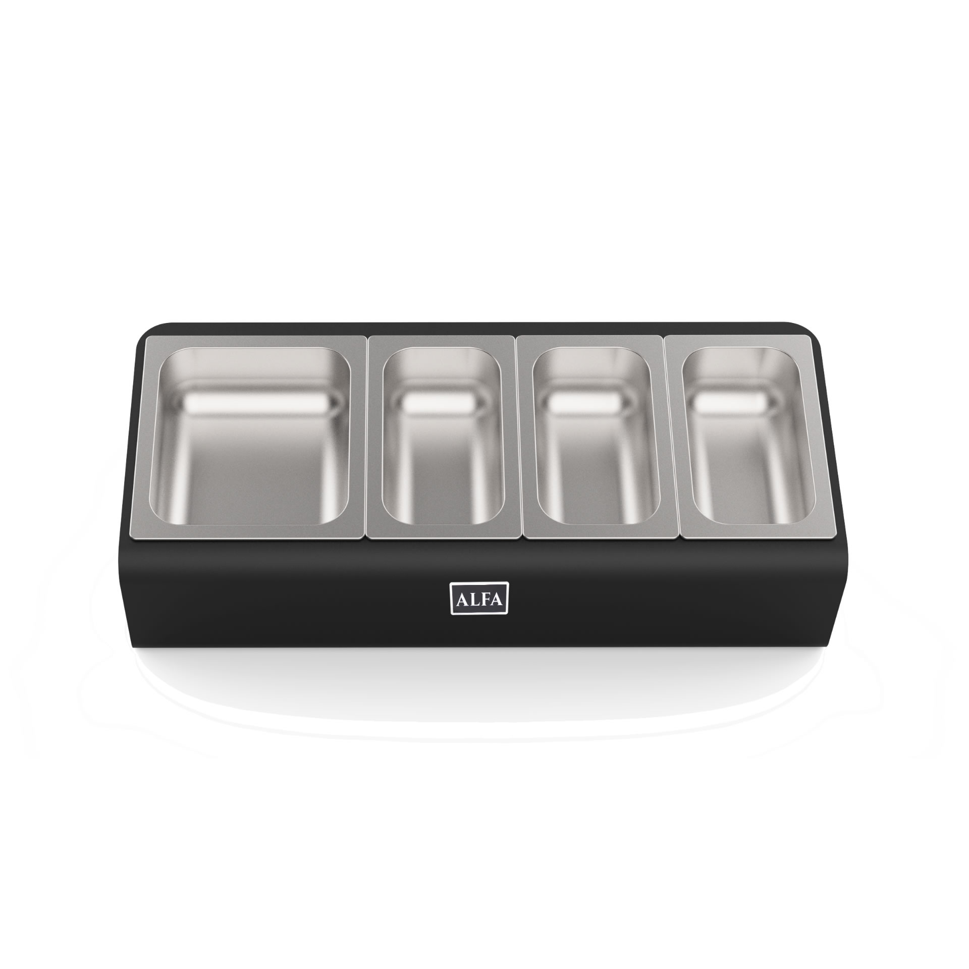 Er besteht aus 2 mm starkem, pulverbeschichtetem Kohlenstoffstahl und bietet Platz für vier professionelle Stahlschalen, von denen drei die Grösse GN 1/9 und eine die Grösse GN 1/6 haben.